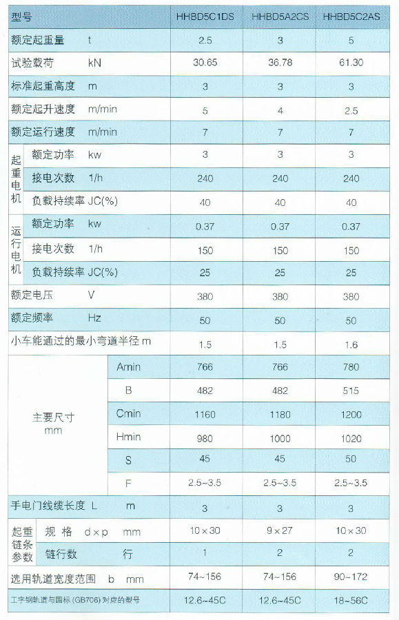 電動(dòng)小車式環(huán)鏈電動(dòng)葫蘆參數(shù)表: